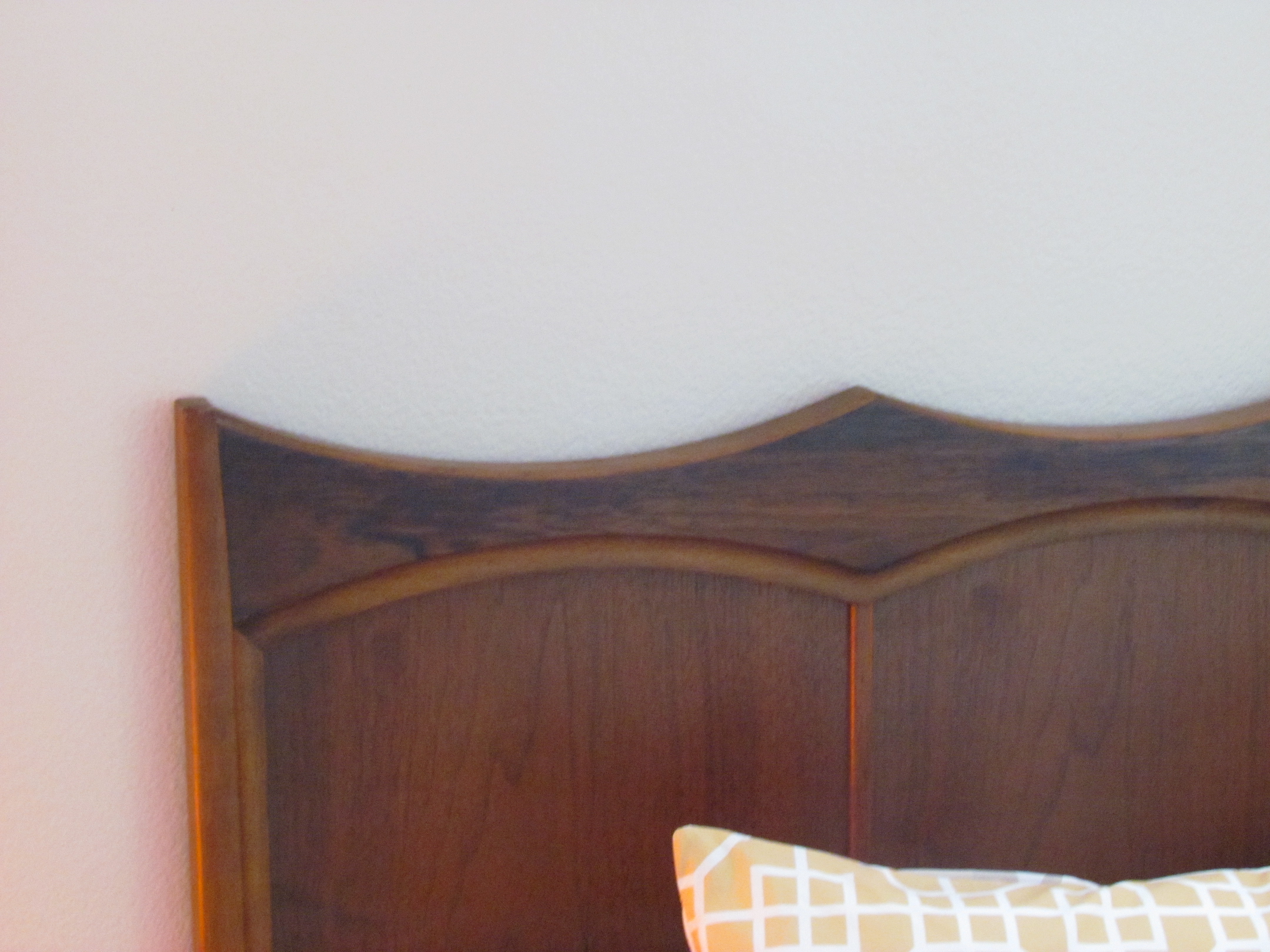 The guestroom “re-deco” is finished, and I’m not sure which designer to thank. I recently found this headboard on Craigslist and decided to jump on it. I likened the guest room to a puzzle, and a headboard was the missing piece. This headboard listing read, “possibly Kent Coffey or Kroehler.” (Both mid-century big shots) Personally, it doesn’t matter to me who the maker is, it would just be fun to know the history behind this piece. I’ve looked, and I can’t find anything out there like it right now. My biggest thanks go to the seller for working with me on price, and my husband for driving to San Diego to pick up this treasure without complaint.