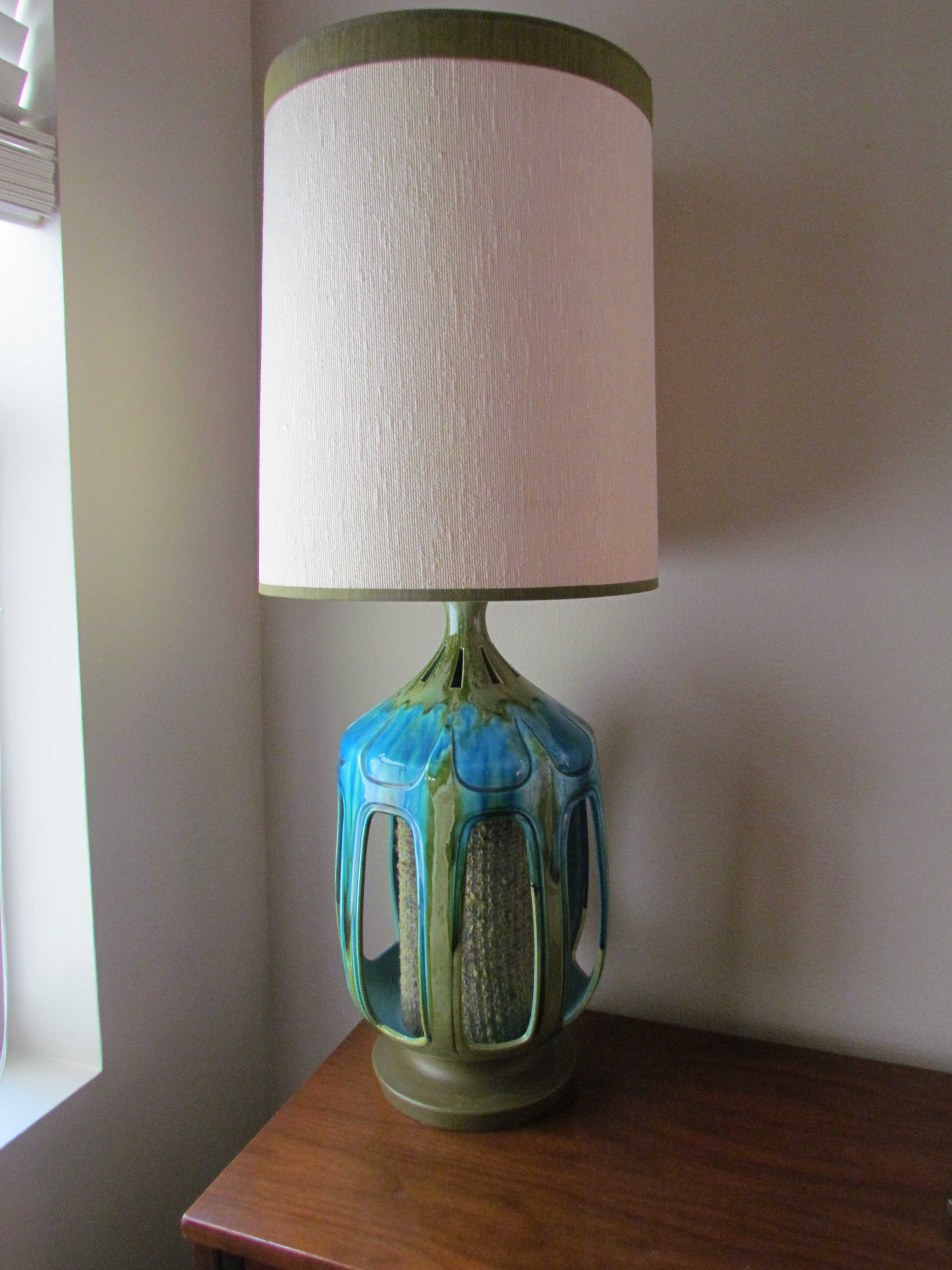 The description read: ” Unbelievable mid-century modern atomic table lamp with gorgeous teal blue and green colors. This was created in a drip fashion. The interior has a wool-type burlap surround. In the style of Royal Haeger, though it is unmarked and a little more wild than their typical style. I have not found any information for this very elusive lamp on the internet.”