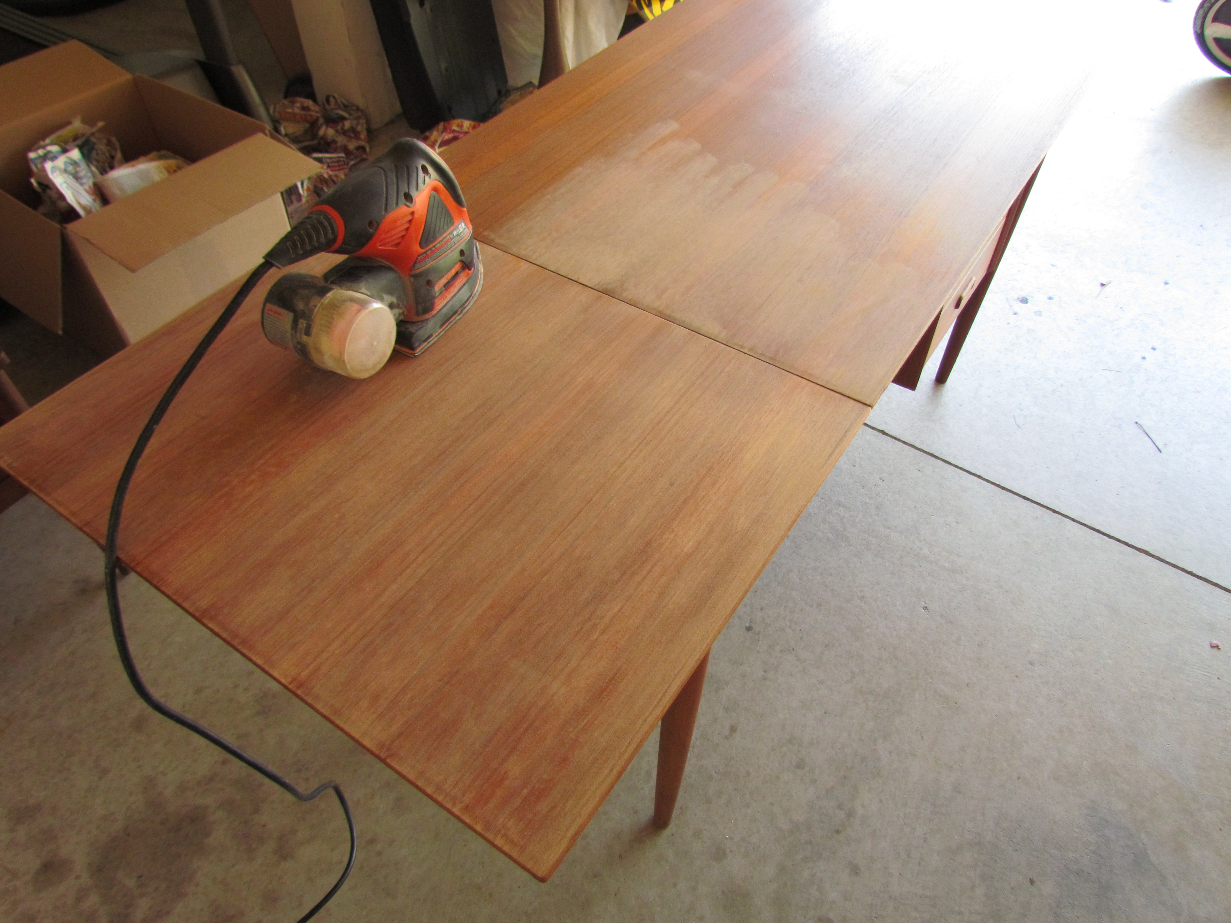 I happen to have the sander my father so kindly loaned to me – complete with fine sand paper, which I used for this project. Here are some sanding shots: