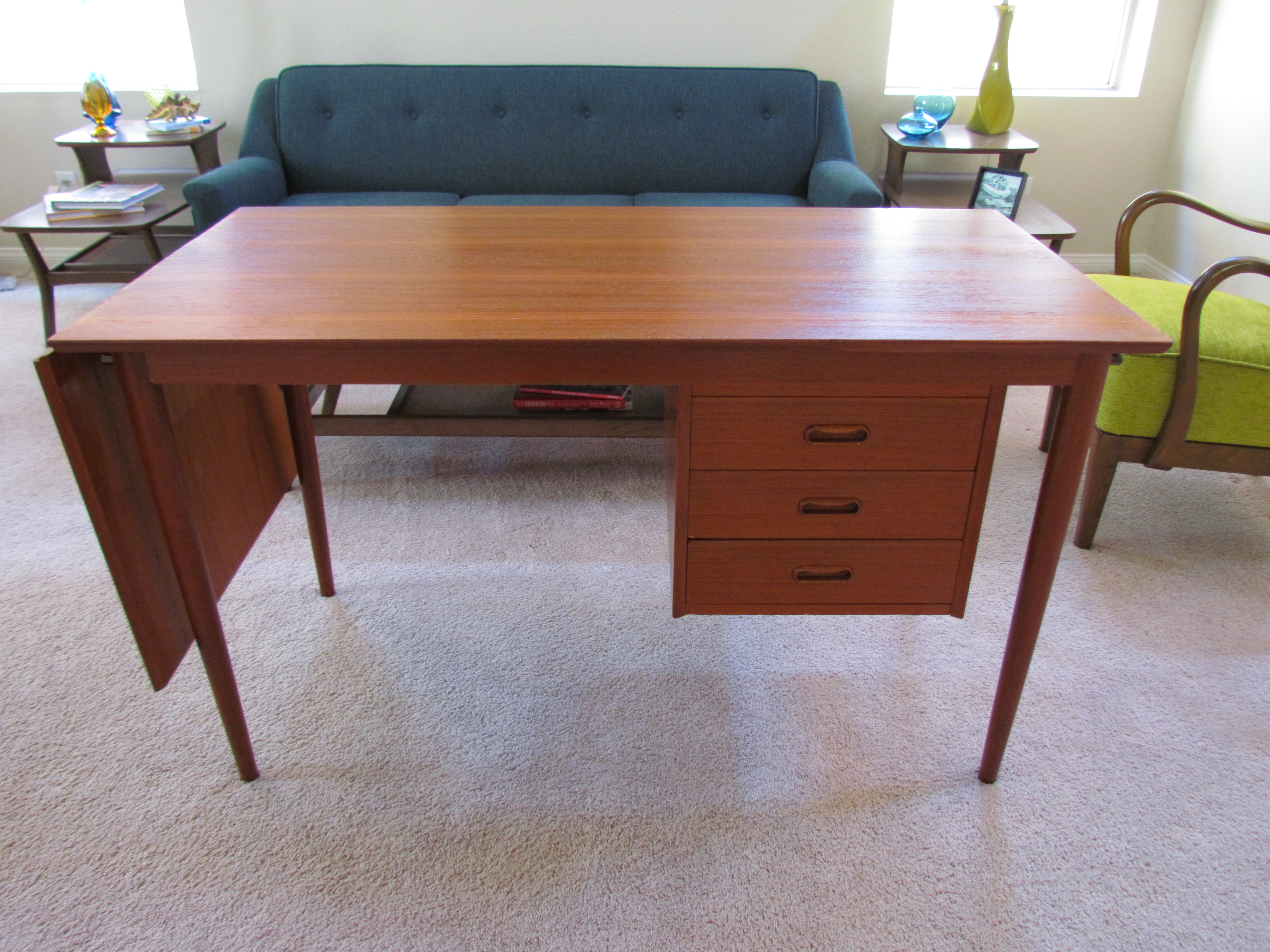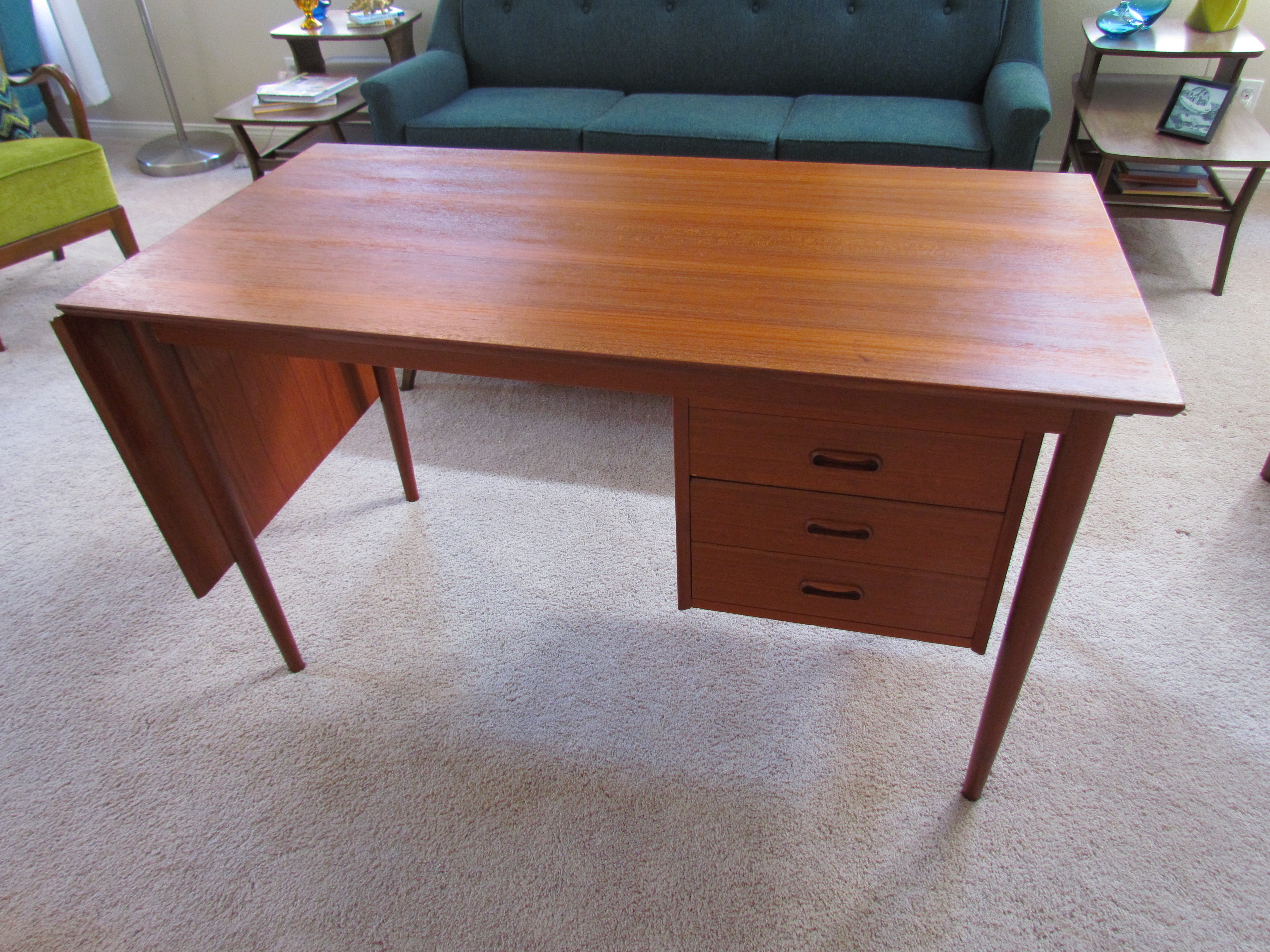 Below are the BEFORE photos. This desk, although completely functional with sliding drop leaf, and drawers that can be moved from side to side depending on your preference, was in pretty rough shape. I can report fading, white drink rings, and what looked to be a burn stain at one side of the desk. I still felt like I was stealing it when I found it at a thrift shop. I mean people….this is TEAK we’re talking about here. Only the most gorgeous wood on the planet.